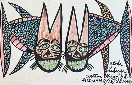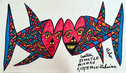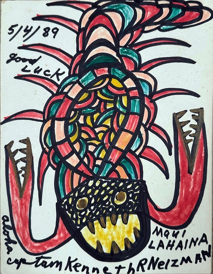 As the exclusive publisher and curator for CAPTAIN KENNY Neizman (1932-2003), Maui’s legendary “Outsider” artist, it was our intention to open a CAPTAIN KENNY Museum/Museum Store/Gallery in Lahaina. The prospective site was under lease negotiations in the Spring of 2023, and then the devastating wild fire (August 8, 2023) reduced the building and the entire town to ashes. The fire also destroyed untold numbers of original CAPTAIN KENNY paintings and drawings that hung in the homes and business’ of local residents who had acquired them, mostly, directly from CAPTAIN KENNY.